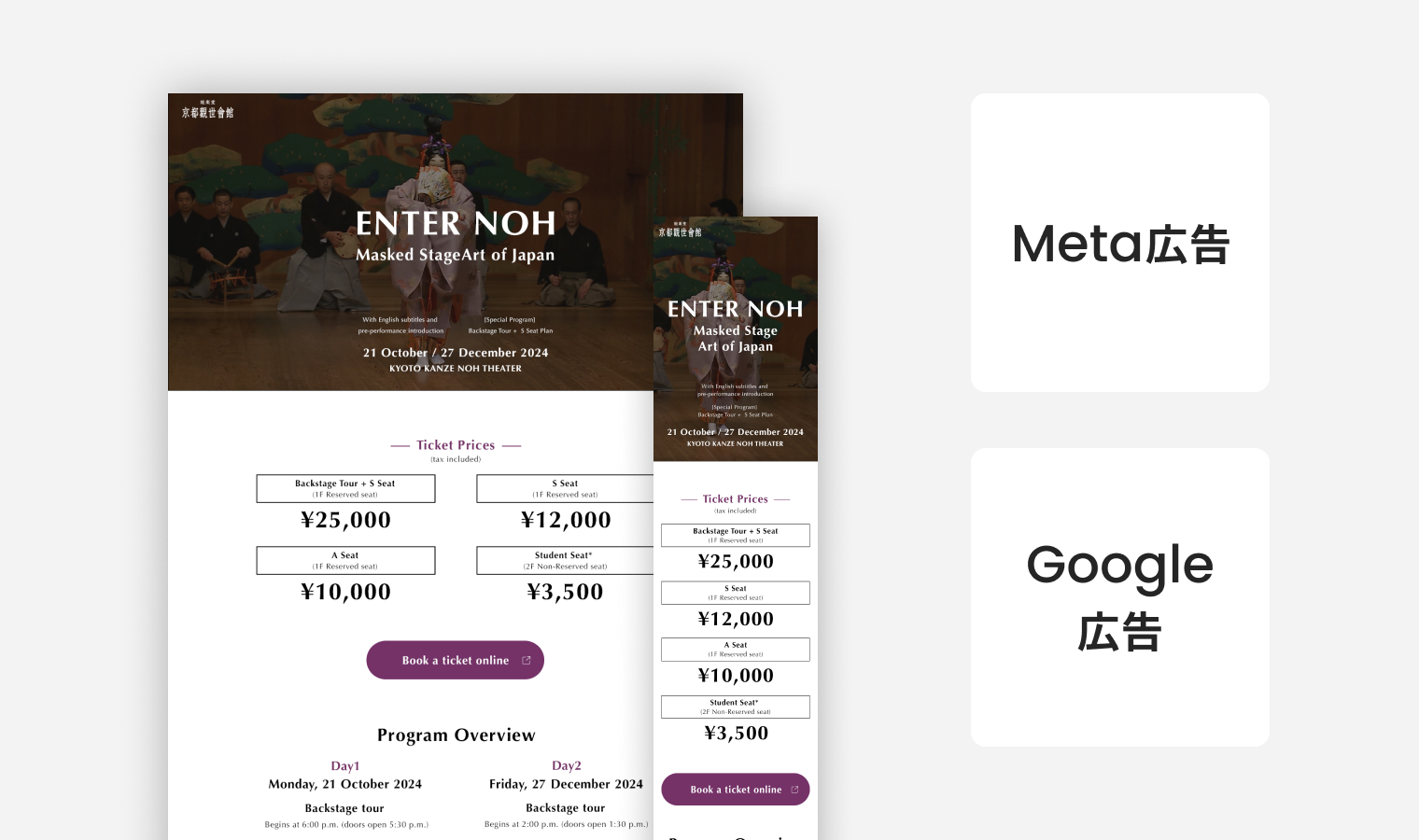 京都観世会では初となる、デジタルマーケティングを中心に据えたプロモーション施策で各公演への集客効率の大幅アップを実現。狙ったターゲットへのアプローチをすることによる効率性の高い集客が可能に。